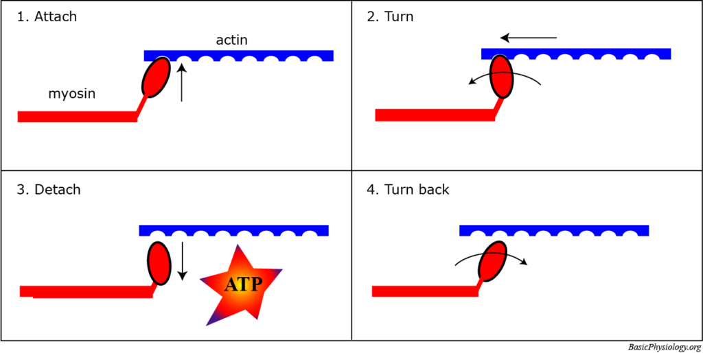 Now repeat the previous steps; the head will attach again to the next hot spot, turn and pull again at the actin molecule