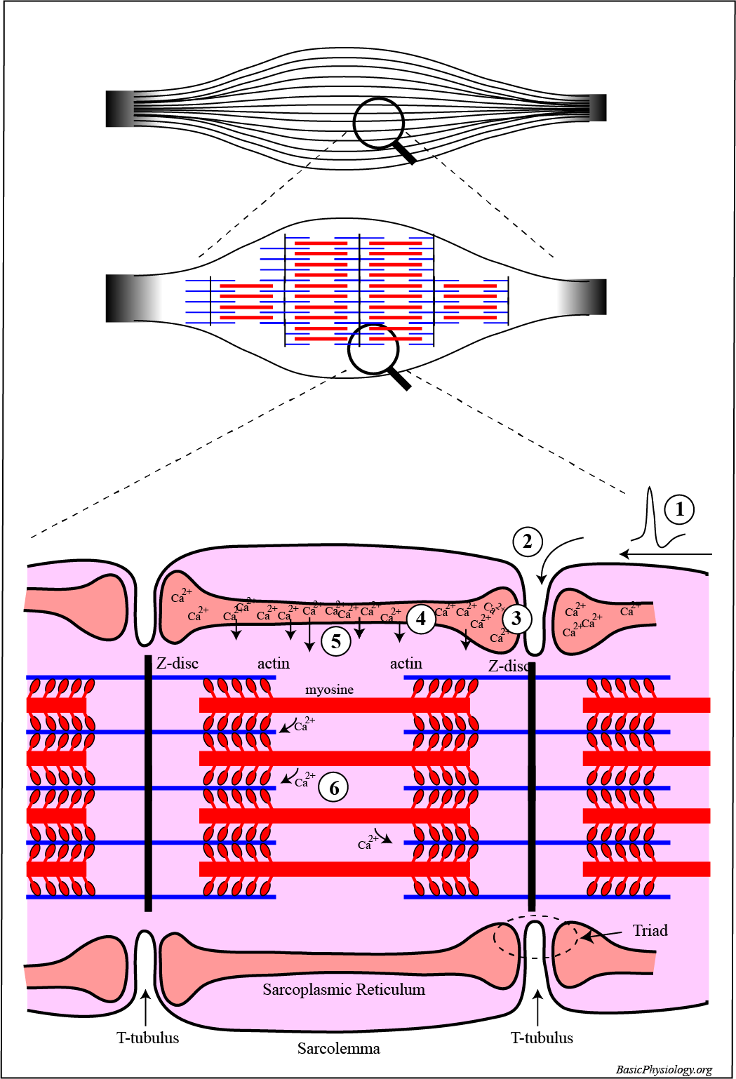Actin hot-spots: Ca2+ ions have a complicated effect on the actin molecule. There is actually an interplay between three molecules: actin, troponin and tropomyosin. For more (technical) information, go to your Physiology textbook (not very important)