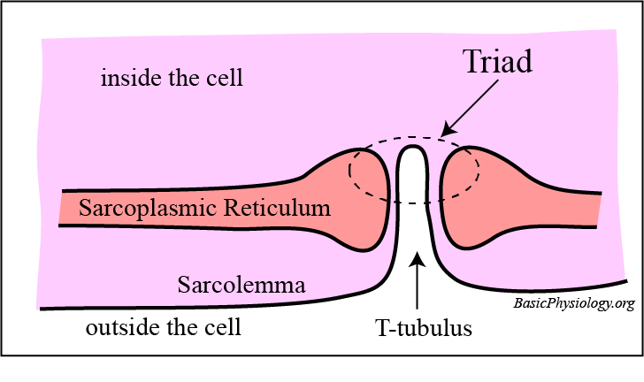 1. Triad: this is the name of the structure at the end of the transversal tubules. There, the cell membrane is close to the membranes of two sarcoplasmic reticula (pleural of reticulum). The proximity of three membranes together is called a Triad (= three).