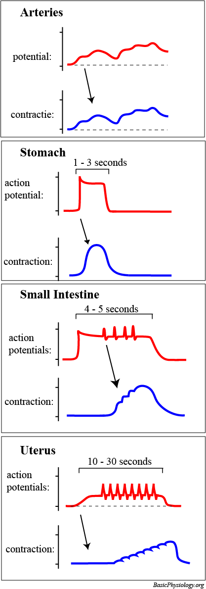 Other smooth muscles resemble the heart, such as the stomach, with a pacemaker region, an action potential that propagates in the wall of the organ and a resulting contraction. Note that the stomach action potential lasts much longer than the cardiac action potential (5-10x).