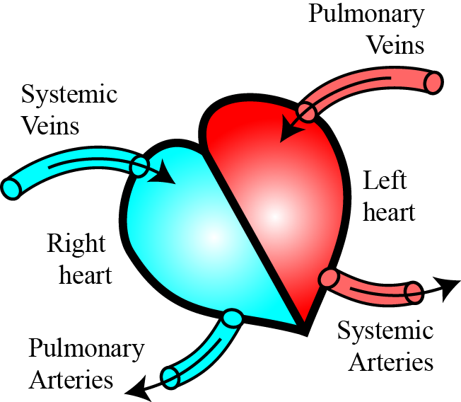 In other words, there are actually two hearts; one heart that pumps the oxygenated blood into the systemic circulation and a second heart that pumps de-oxygenated blood to the lungs.
