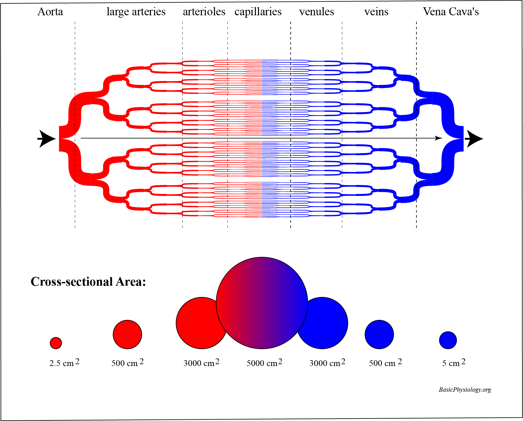 The cross section of all the capillaries together is a total of 5000 cm2, compared to only 2.5 cm2 for the aorta (2000x!).