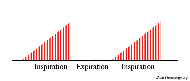 Notice the shape of the burst of action potentials in the diagram. They start very small (= very few action potentials) but the number of action potentials gradually grows until maximum is reached at the end of the inspiration. (link to smooth tetanus)
