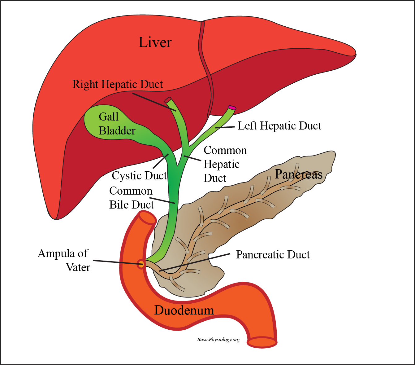 But when chime arrives in the duodenum, then the gallbladder contracts and the bile is pushed into the duodenum through the common bile duct.