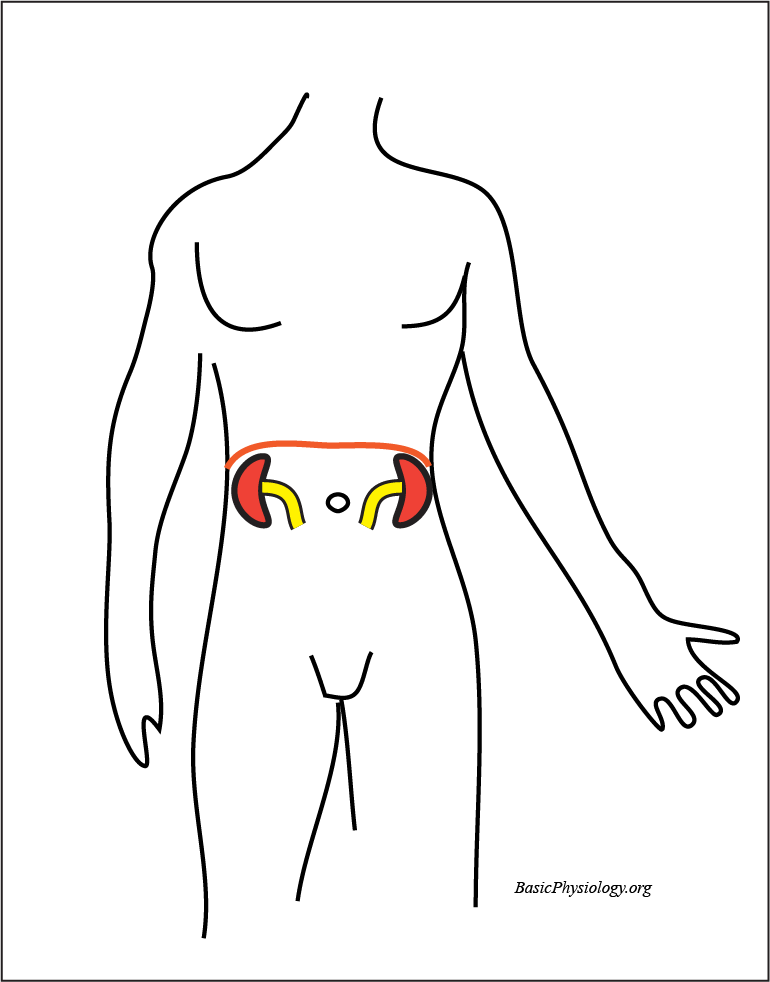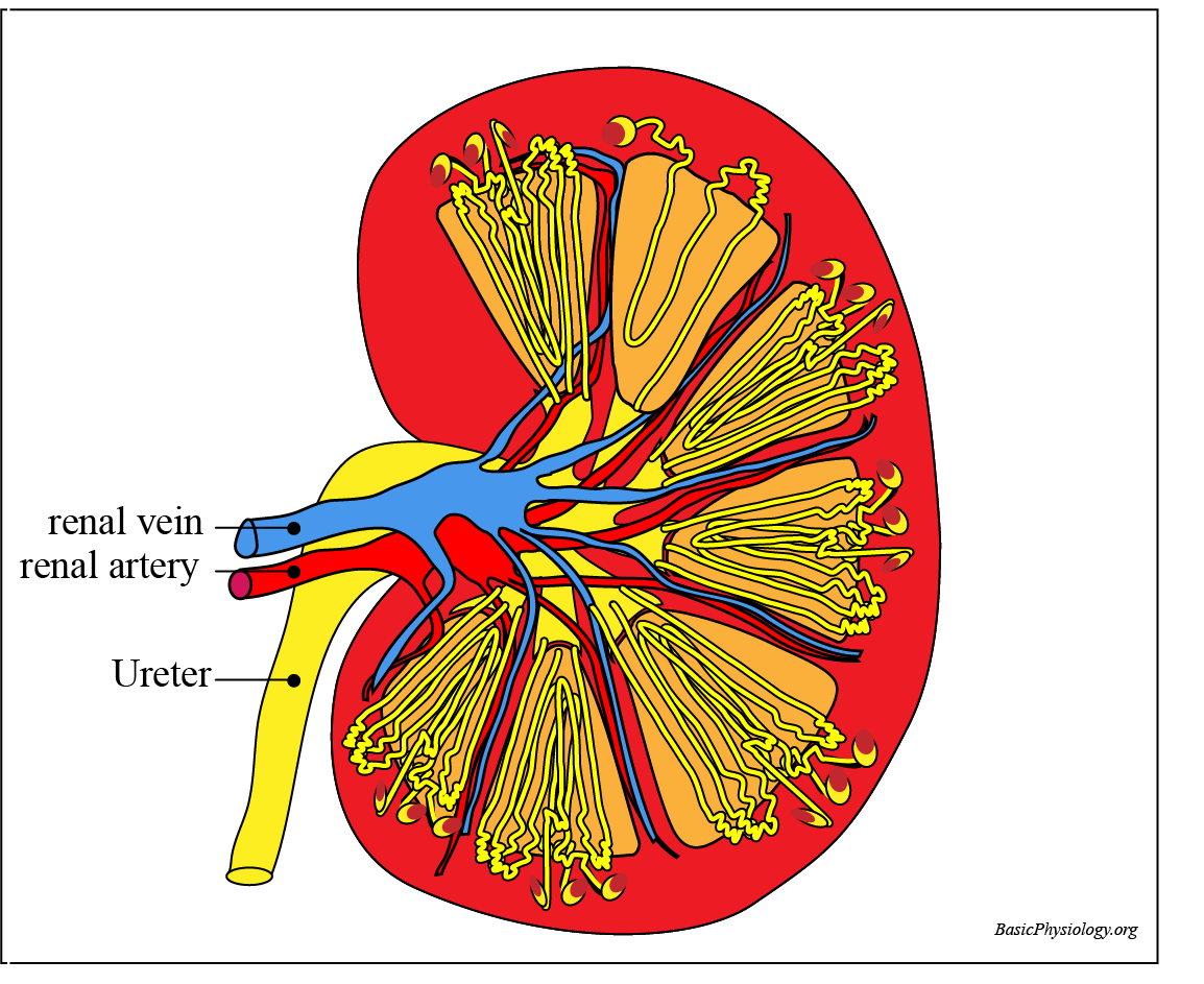 In this diagram, you can also see the location and shape of one nephron and its tubule; this is the functional unit of the kidney.
