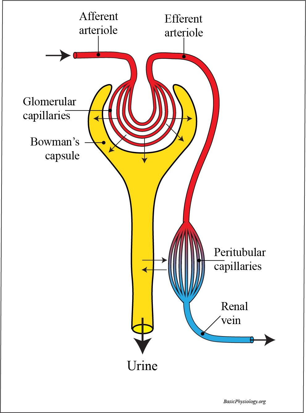 is what happens in the glomeruli. In principle, except for the blood cells and large proteins, everything else is filtrated through the capillary membrane into Bowman’s capsule, thereby forming pre-urine.