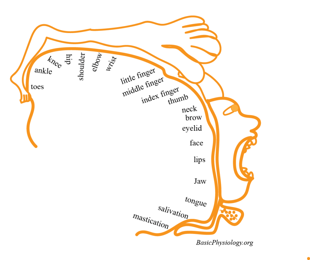 Sometimes, this is called the cortical “homunculus”. This is Latin (again!) for a small human being, but distorted to reflect the degree of motor neuron innervation of the body parts.