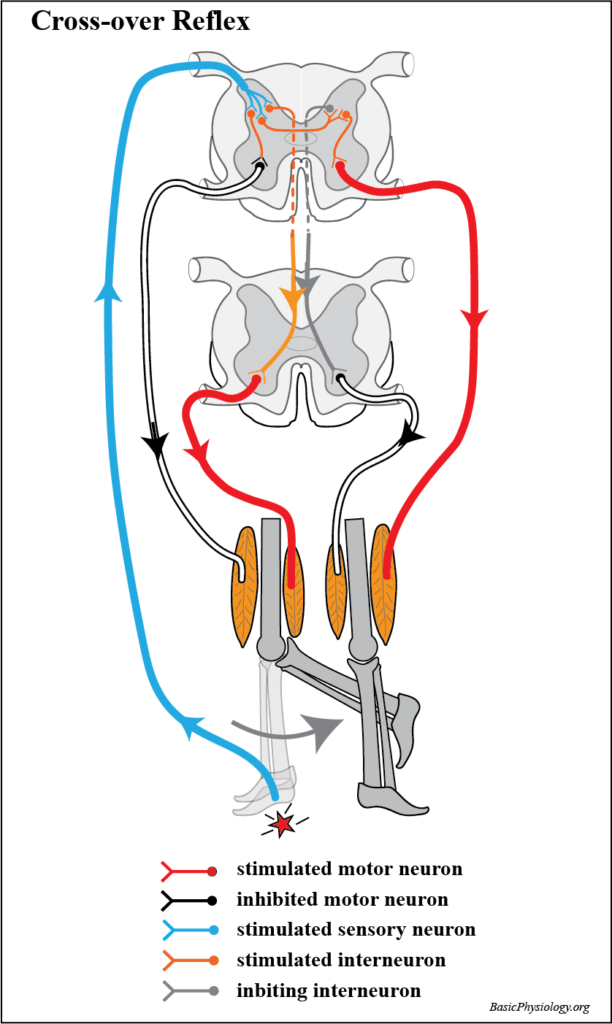 At the same time, the opposite extensor muscle in the right leg must be inhibited. Like in the withdrawal reflex