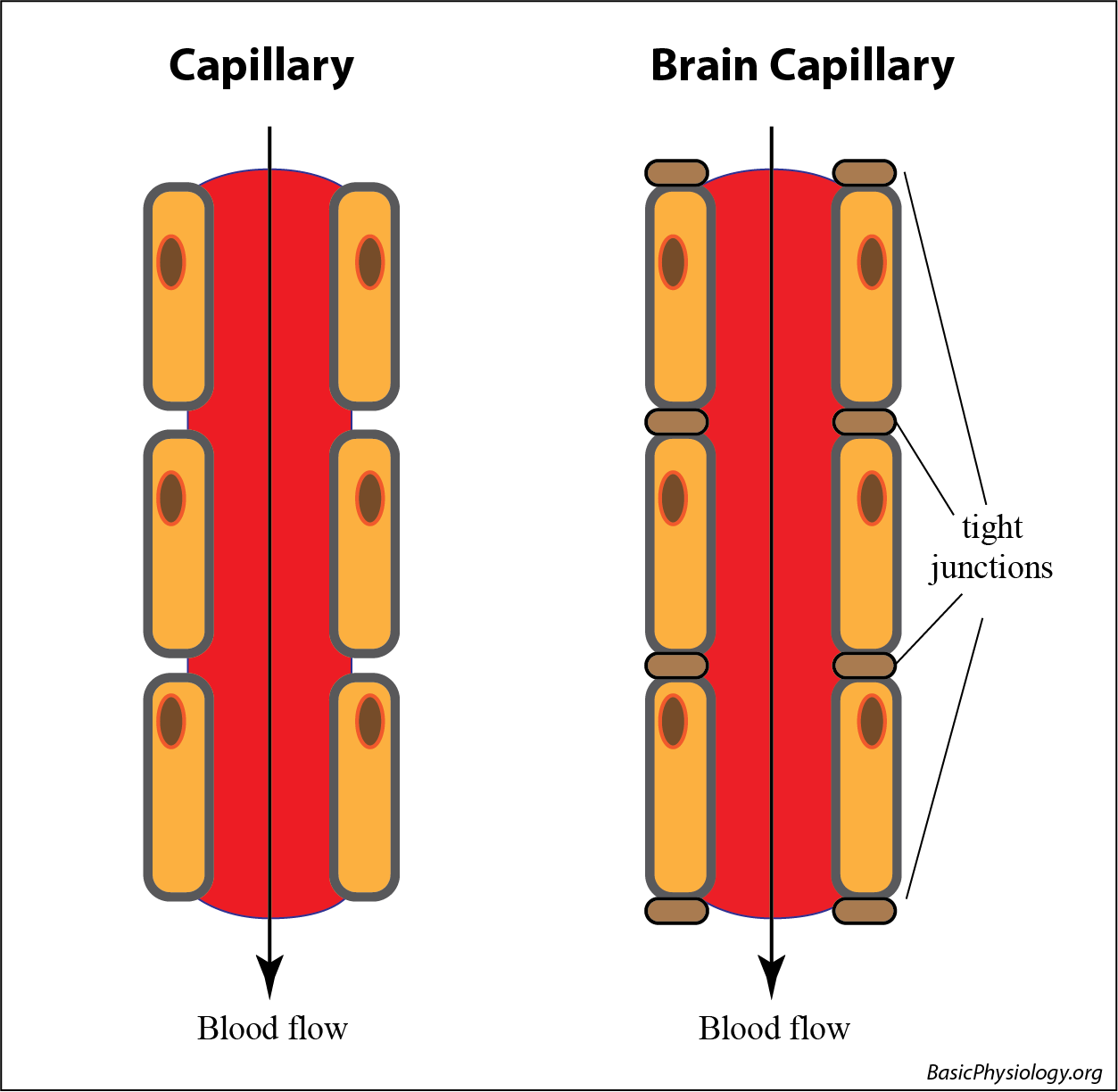 As you can see in the diagram, the boundary of the capillaries between the blood and the interstitium, which is readily accessible in normal tissue, is firmly closed by tight junctions in the brain; hence the name Blood-Brain-Barrier!
