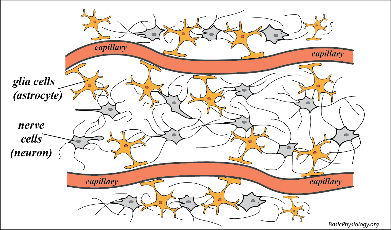 This diagram displays the architecture of the tissue located in the brain between the capillaries. As you can see, there are capillaries and many nerve cells.