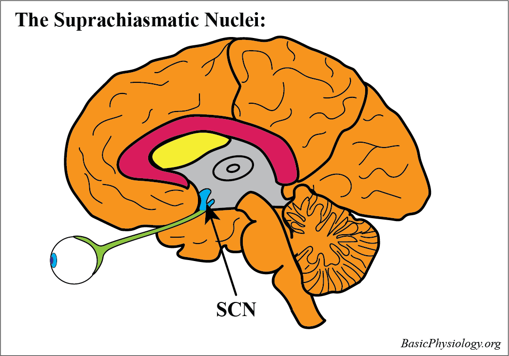 From this, it is obvious that signals from the eye, which registers the presence or absence of daylight, will inform the brain centre (SCN) on the situation outside the body.